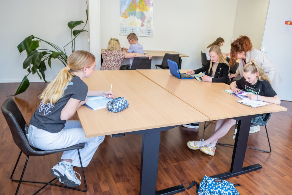 Max 6 leerlingen per begeleider. Gemixte leeftijden/niveaus. Ieder eigen huiswerk. Veel persoonlijke aandacht. Leren van elkaar.